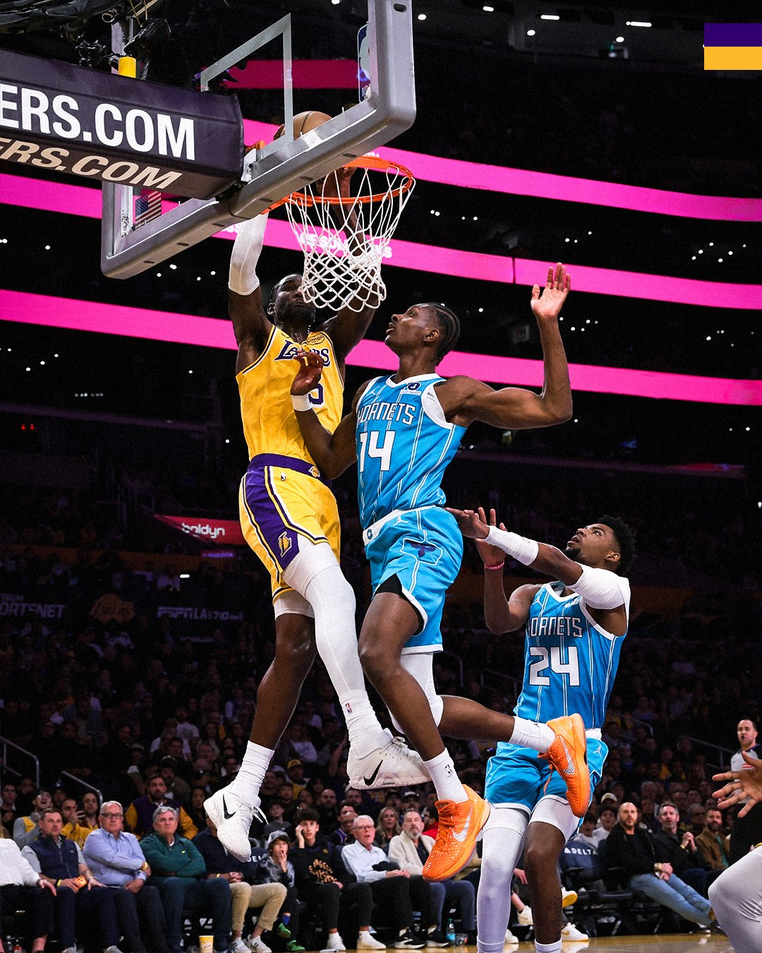 黄蜂队的鲍尔得到30分、6个篮板和11次助攻,米勒得到26分和5次助攻,布里奇斯得到25分和8个篮板,科奴佩尔得到19分和7个篮板。湖人队的东契奇得到39分和4次助攻,勒布朗得到29分、9个篮板和6次助攻,拉拉维亚得到18分,艾顿得到12分和6个篮板,斯马特得到10分和4个篮板。