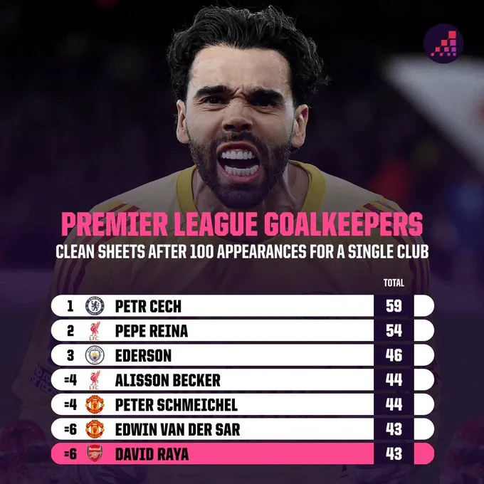 英超达百场门将零封场次榜:切赫59场第1,拉亚43场并列第六