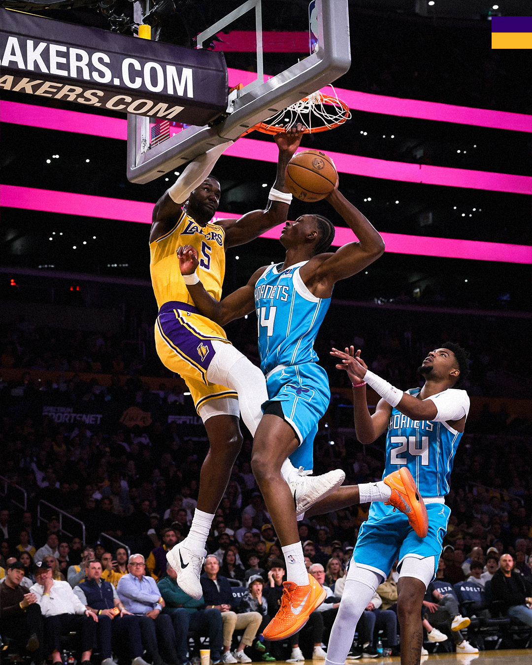 黄蜂队的鲍尔得到30分、6个篮板和11次助攻,米勒得到26分和5次助攻,布里奇斯得到25分和8个篮板,科奴佩尔得到19分和7个篮板。湖人队的东契奇得到39分和4次助攻,勒布朗得到29分、9个篮板和6次助攻,拉拉维亚得到18分,艾顿得到12分和6个篮板,斯马特得到10分和4个篮板。