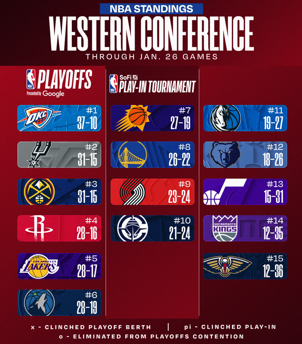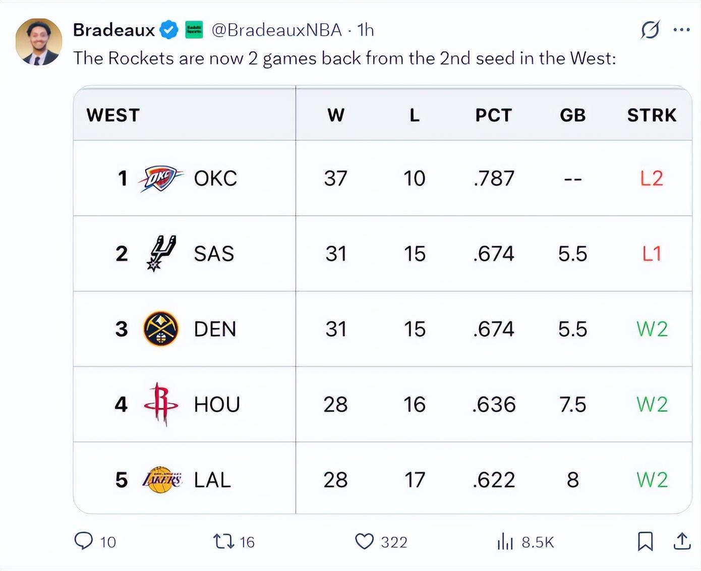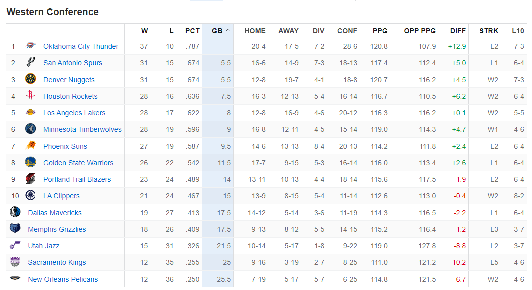 这个比赛日后,西部排名:雷霆、马刺、掘金、火箭、湖人、森林狼、太阳、勇士、开拓者、快船、独行侠、灰熊、爵士、国王、鹈鹕。