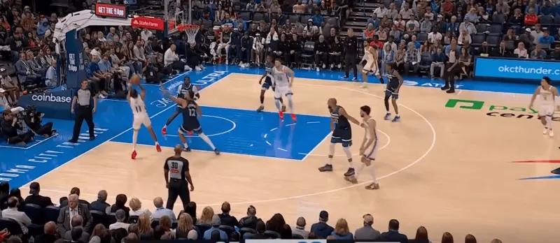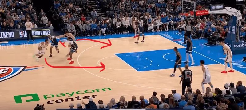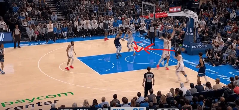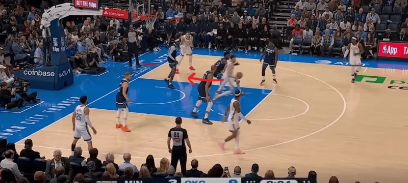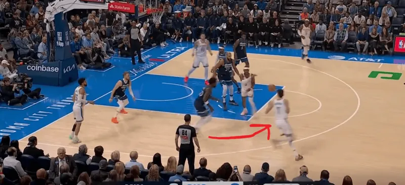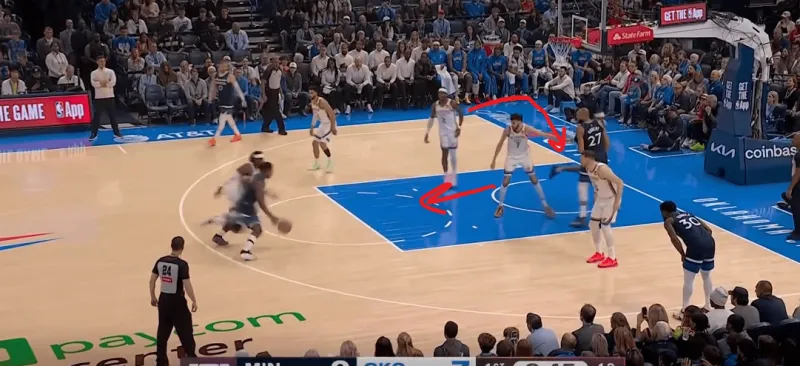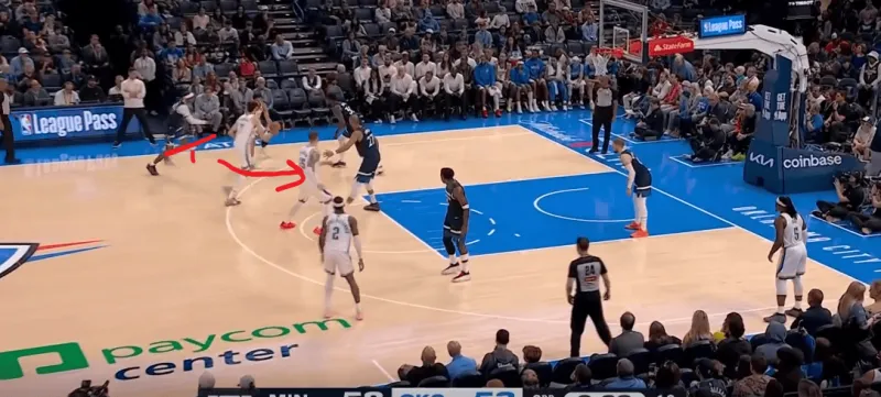 防守端雷霆双人逼迫多森姆走底线,弱侧的切特先是封锁底角的接球,随后见多森姆传篮下戈贝尔,又迅速回收将球抢断,成功完成弱侧一防二。断球后迅速策动反击,接以赛亚乔高抛篮下杀伤: