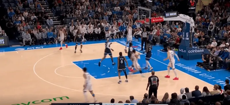 雷霆前场三对三,SGA面对底线附近的严防,身后切特迅速切入篮下,利用爱德华兹和戈贝尔的注意力接SGA高抛完成终结: